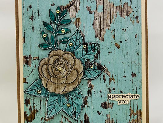 Flower Image: Using brown ink and the Altenew Evergreen Beauty set, stamp the image on left bottom corner of a teal wood patterned paper 3.75×5-inches rectangle (Stampin’ Up – Country Woods). Stamp it again on a scrap of the same paper and color with teal watercolor pencil and teal marker. Fussy cut around the entire colored image. On a scrap piece of ivory colored woodgrain paper, stamp the flower and color with a brown watercolor pencil. Fussy cut around the colored flower.