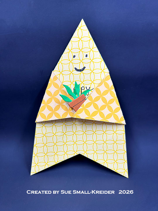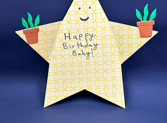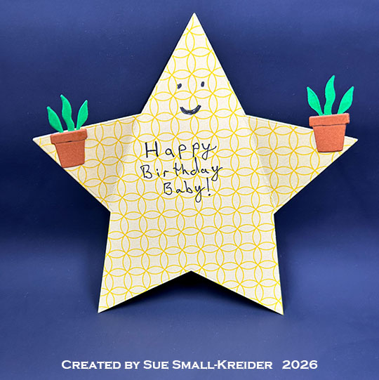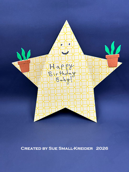 Cardbase: I started with a 6×6-inch square of double-sided patterned yellow cardstock and die cut the largest five pointed star that I had in my stash. I folded two of the star points to the inside to make a rocket shape and decided to make a smiling face.