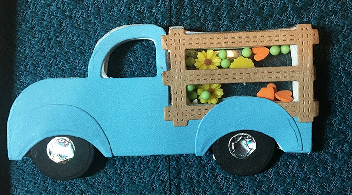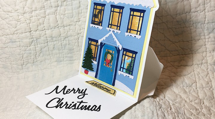 The card is a slight deviation from the die set’s easel card. This card uses a DIY slider base with the ribbon smoke and chimney as the pull tab. The house still is an easel card, but one that is operated by a slider tab. (A good video on DIY slider easel cards is by Maggi Harding.)