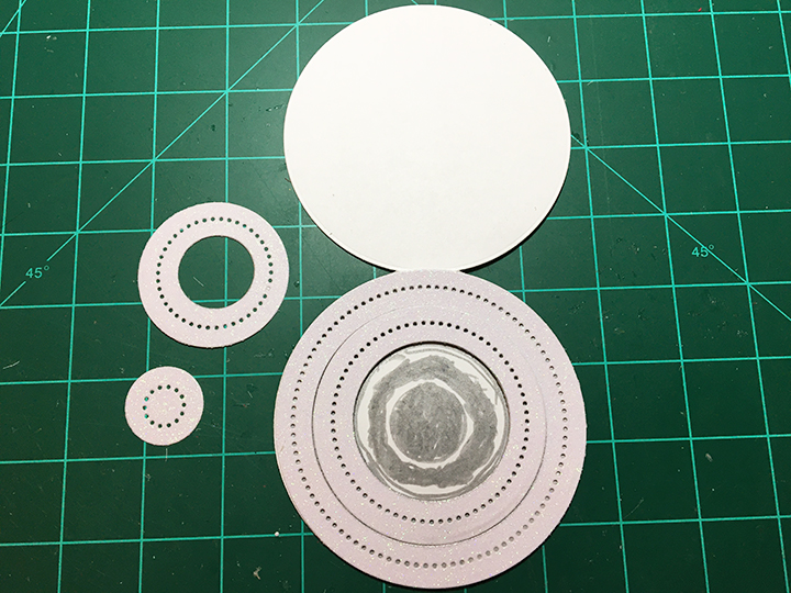 The welcome mat was stamped and heat embossed using a stamp from a retired Stampin’ Up set. I used a blend of Ranger Black Sparkle and Recollections Ebony Detail Embossing powders that give the welcome mat a snowy sparkle. Once heat embossed, the mat was weathered using Antique Linen Distress Ink on a sponge dauber and cut out with the coordinating die. Foam tape was used to adhere the mat to the sliding tab.