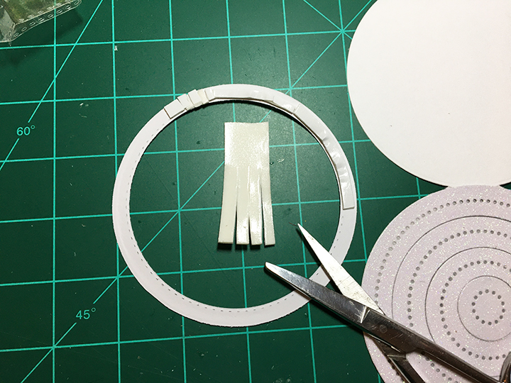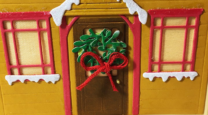 The windows all have a piece of pale blue organza ribbon taped behind the window frames to give the shine of glass and the rosy glow comes from some shading with Fossilized Amber Distress Ink on the pale-yellow cardstock. The boy and woman decorating a Christmas trees that can be seen in the windows are from an older Tonic Studios Toy Emporium die set. Also, from the Tonic set is the outside fir tree and door wreath.