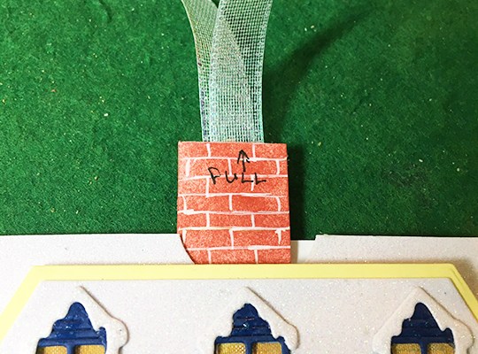 The slider tab was first embossed using a brick stencil (See video by The Paper Boutique on dry embossing with stencils) and then inked with Fired Brick Distress Ink. To make the mortar lines standout, I used a white gel pen. I cut the chimney extra-long so I could fold it over and strengthen the pub tab and so I could punch a hole to thread the ribbon through and secure it to the back side.