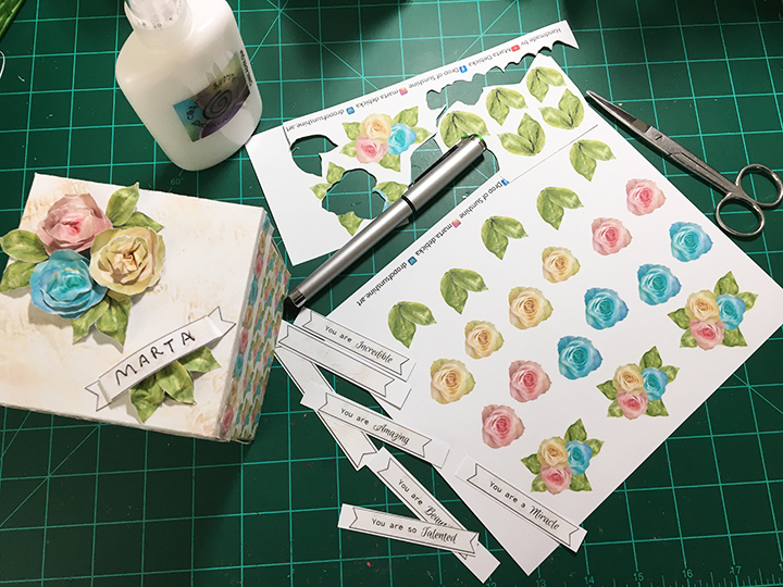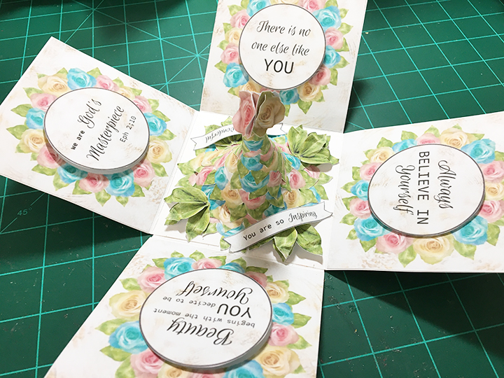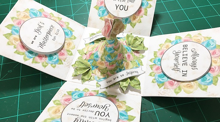 Glue the back posts to the back ‘mountain’ of card base and front posts to front “mountain” of base. Decorate with as desired with flowers and sentiment. Add a white strip of cardstock to back side of base to write a personal message.