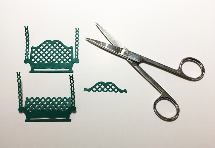 Die-cut: Cut the whole swing die out six times – 2 green, 2 pink wood, 2 white wood. From these six designate one of each color to be the front section and one of each color to be the back section. The pink wood pieces will be used as the section bases. The chain with the bench attached should be trimmed from the roof of the pink pieces. Cut the rounded bench arms with the chain attached off the pink bench pieces and discard the bench remains.