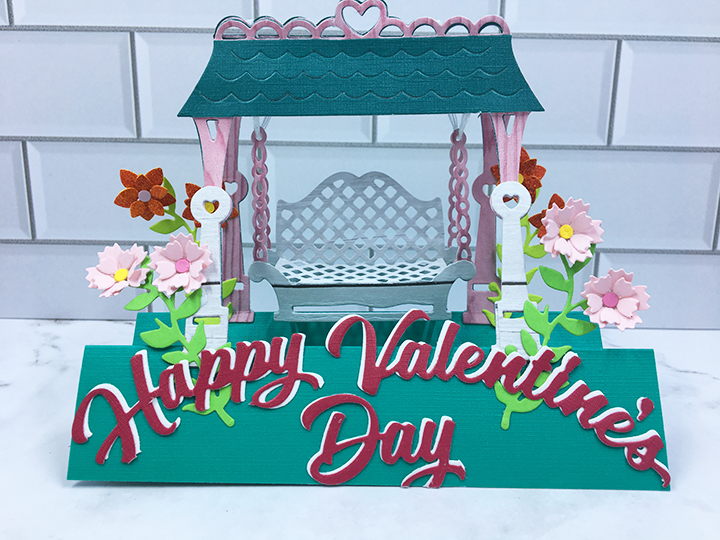 Garden swings have played a role in the courtship of the lovely couple for whom this card was made. So, an interactive card to reminded them of their early days getting to know one another is appropriate.