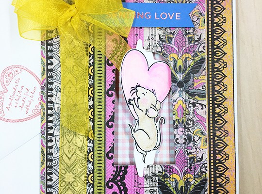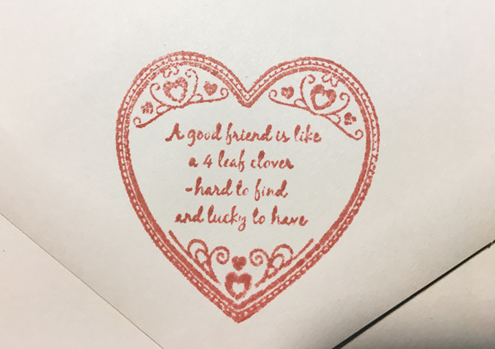As is my style, I stamped the back of the envelope with a BoBunny hearts stamp three times in a cherry red ink to hint as to what is inside.