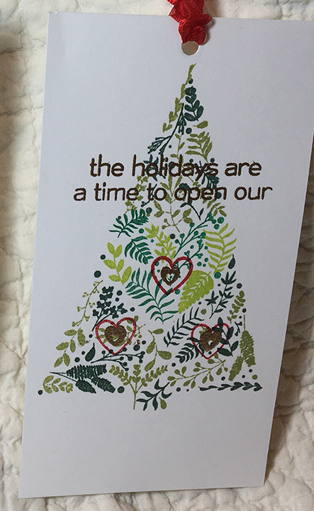 “The holidays are a time to open our hearts” is the sentiment that these festive gift tags have. These tags were stamped with the Alte New stamp set Festive Foliage which allows you to stamp a fir tree with two to four colors. There is a heat in the center of the tree foliage.