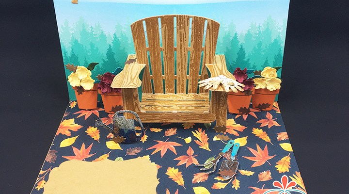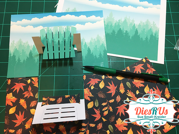 Once all layers of decorative papers have been adhered to cover all four sides of card base, place the platform on the bottom inside of card with taped edges just below the case base fold as shown in photo. Hold center tab down and peel off tape from it and the two platform tabs. Fold down card base top and adhere base to it. Fold down front tab of platform to desired position. Peel backing off tape and adhere to base. Platform should pop up when card is opened. Fold the two strips cut with platform die and glue into slots as shown in photo.