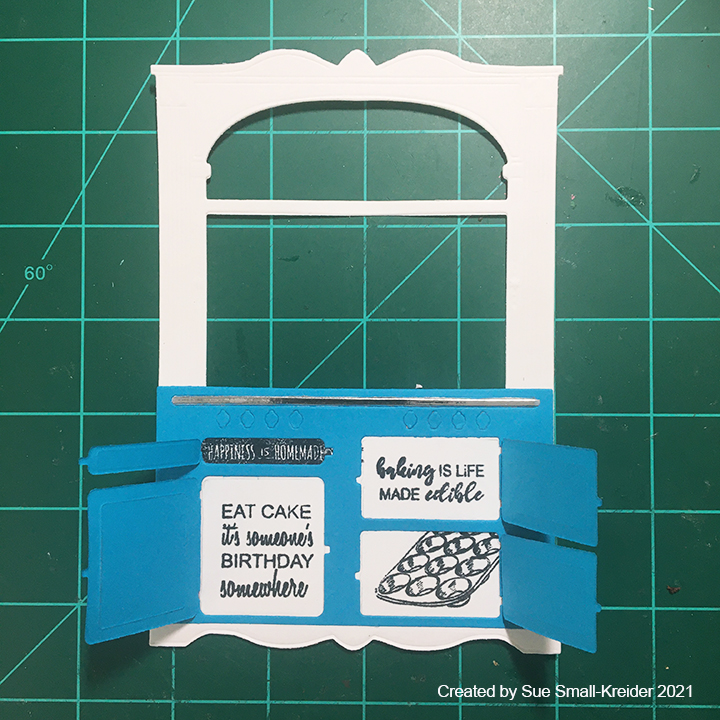 Stove Assembly: Cut another stove from blue cardstock. Glue all the doors to the backs of the “enameled’ doors from first step. Glue the stove front to dresser matching up stamped images with the door openings. Adhere two layers of the blue stove knob cut-outs to top of stove. (This will add some dimension to make the knobs be raised up from stove front.) Cut from silver mirror cardstock the knobs, thin line trim, door hardware, stove burners and utensil rack. Glue silver hardware onto doors and knobs and silver trim in place. Glue door hinges into place on to stove front being careful not to get glue onto stamped images. Once glue is dry, fold doors back to crease hinges. Cut a 1/2 inch x 4 1/2 inches strip of blue cardstock for the stove burners crossbar. Glue dresser on to card base after the shelf and burners step.