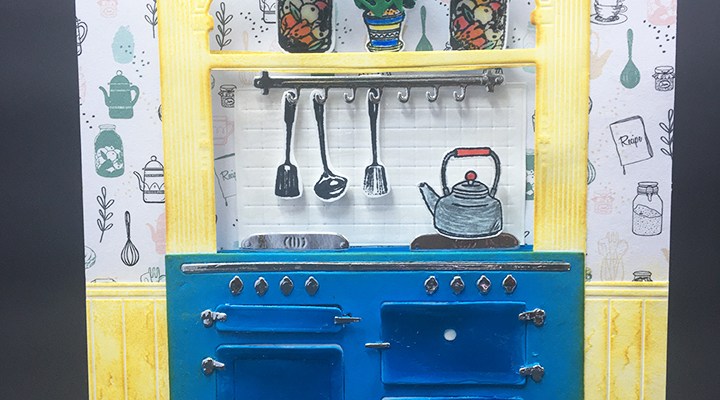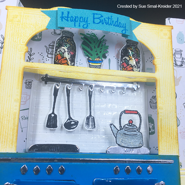 Shelf and Burners: Stamp color and cut out herb pot, utensils and kettle. With tiny dots of glue, attach the utensils to the silver rack and add tiny piece of foam squares to the back of the rack and utensils. Attach the kettle to the from of a stove burner. Fold 1/4 inch tabs blue crossbar at each end. Using scraps of blue, attach the burners to the blue crossbar centering them over the stove knobs. Glue the backsplash tile onto the card base above the burners. Adhere the utensil rack above the tile backsplash. Assemble the shelf and its contents in the same manor as the stove burners crossbar. Glue in place to card base using pencil marks.