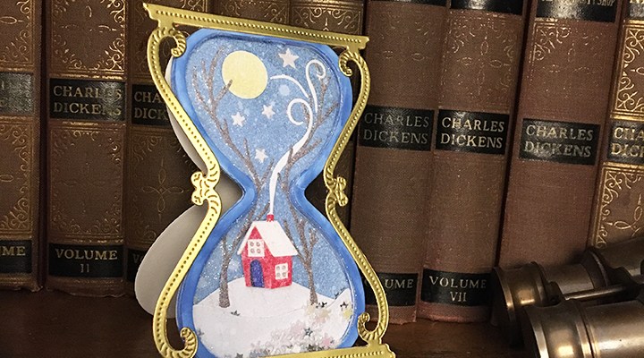 Having made this hourglass card once before, I realized it would make a lovely winter Valentine with the Penny Black’s stamp sentiment “I love you to the moon and back” if I added a 3/4 inch moon to the scene. The Greetery’s Hourglass dies make this an easy card to create, but time consuming to cut and color all the pieces.