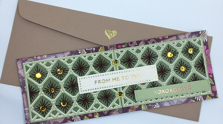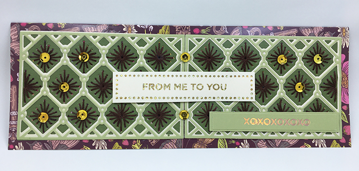 The front sentiments “FROM ME TO YOU” (in Speckled Aura foil on cream cardstock) and “XOXO” (in Aura foil on dark green cardstock) are glued to other scraps to give them some firmer stability before being adhered to the card front with foam squares. Ten gold sequins were added to the tops of the stitching and where the lattice frames meet for a bit of sparkle.