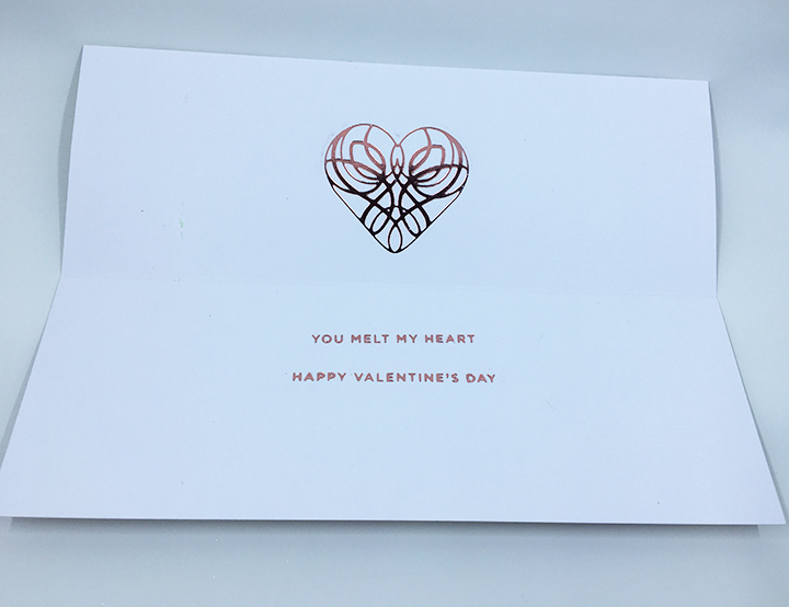 A gold heart rub-on transfer was added to the back of the brown envelope. A chocolate bar will be bundled under the card-stuffed envelope and tied with a white ribbon for presentation.
