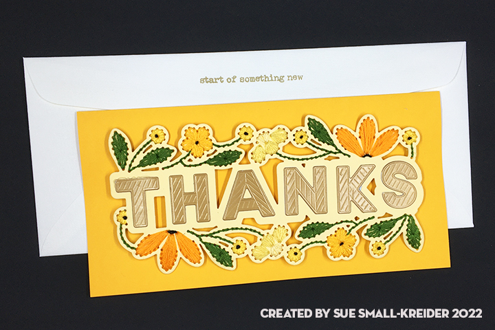 Bright yellow and orange flowers stitched around a golden “THANKS” makes for a sunny thank you.