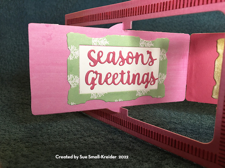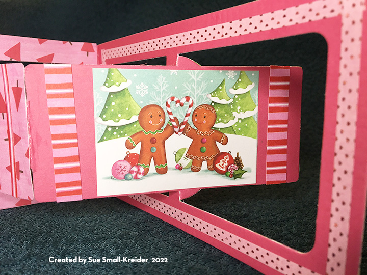 Gingerbread, candy canes and snowmen make this accordion card a treat for the eyes and imagination. The papers are all by Heitz Cuppleditch for Craft Consortium. The accordion-fold card base dies, words and frame dies are all by Karen Burniston.