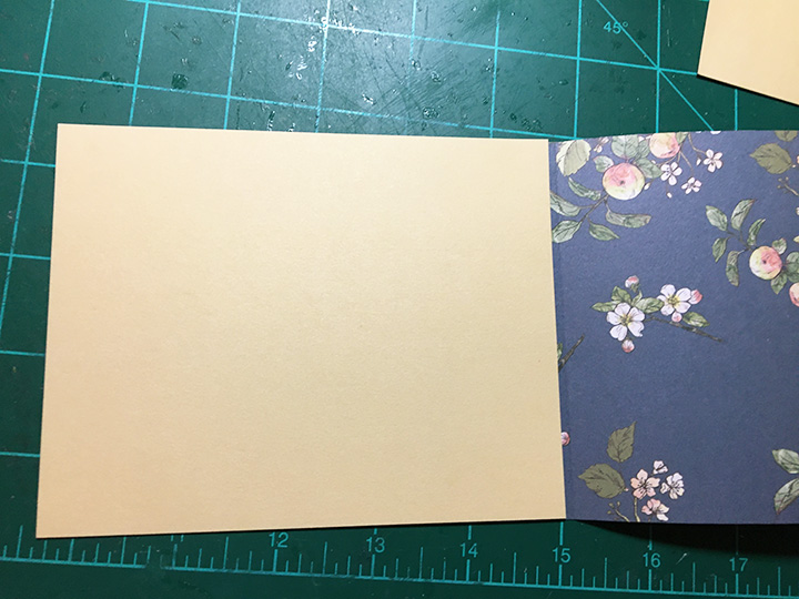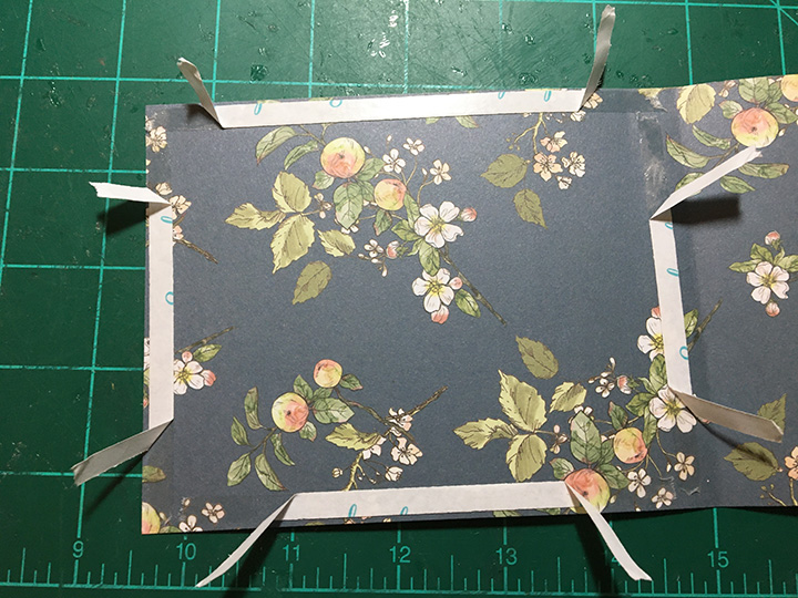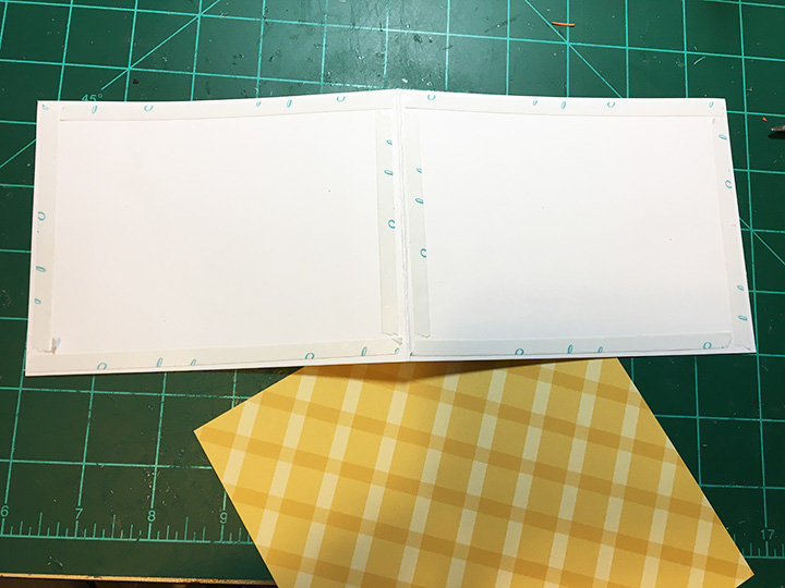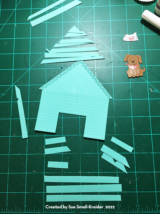 Cut “logs” from wood grain paper, ink the edges to create roundness and glue in place both on the outside of the card and the inside wall. Cut thinner strips of the woodgrain paper for the floor of the cabin, ink edges and glue in place alternating the seams as a real floor would be installed. (I had left over pieces of woodgrain paper from cutting Karen Burniston’s Landscape Rectangle Accordion that I used to frame the window.)