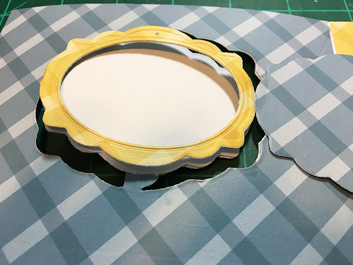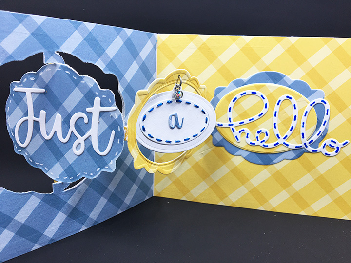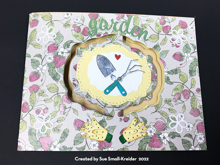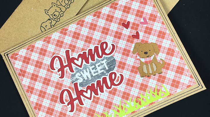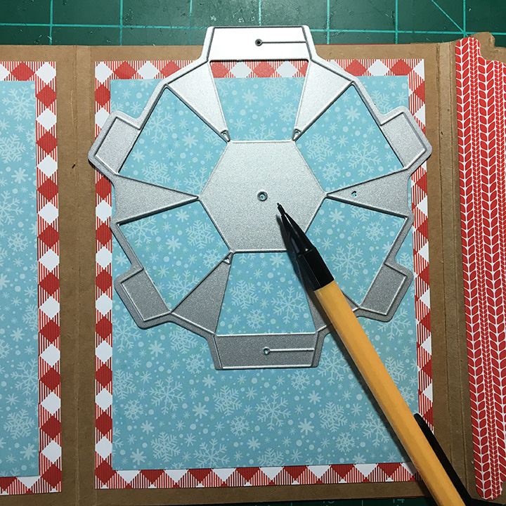 Card Base with Window: Starting with a 10 x 7 inch piece of cardstock, scored and folded in half to create a 5 x 7 inch top folded card base. Position the Mini-Ball Double-Ups die so that it will look good from the outside as well as the inside next to the fireplace. The orientation of the widow will be up-side down from what is on the opposite side of the card. Die-cut the window with the card open on a die-cutting machine. (This is the only time you’ll need a wide platform die-cutting machine. If you only have a 6-inch-wide machine you can cut you card base in half, cut your window and glue a strip of paper as the card hinge.)