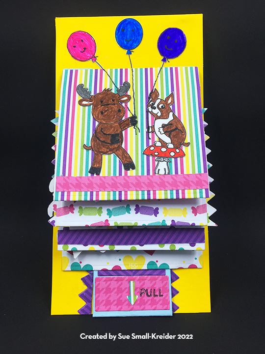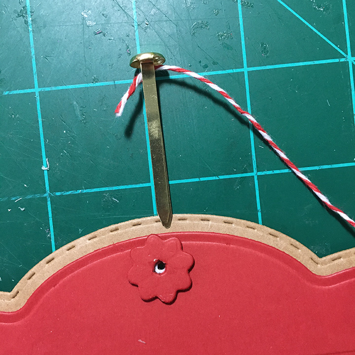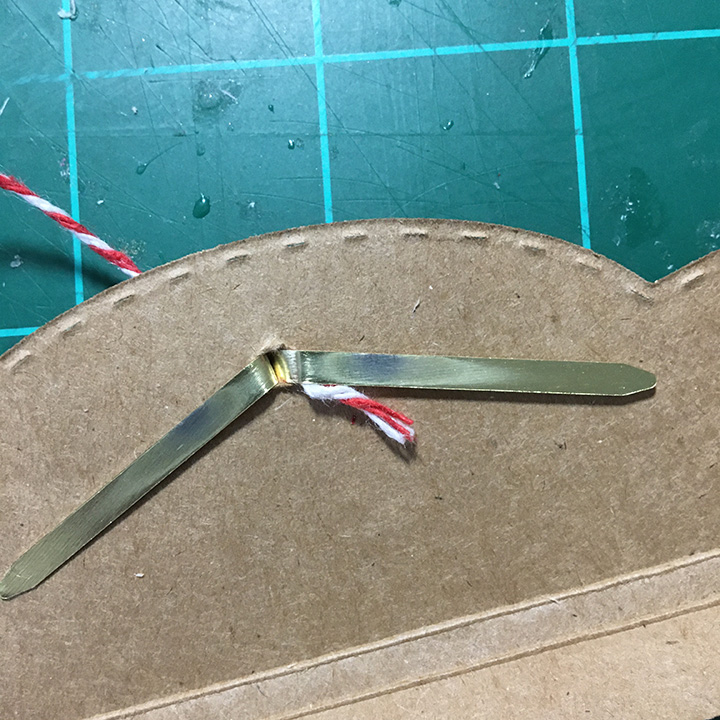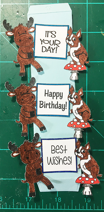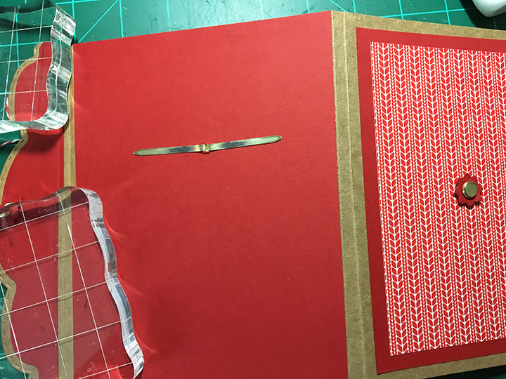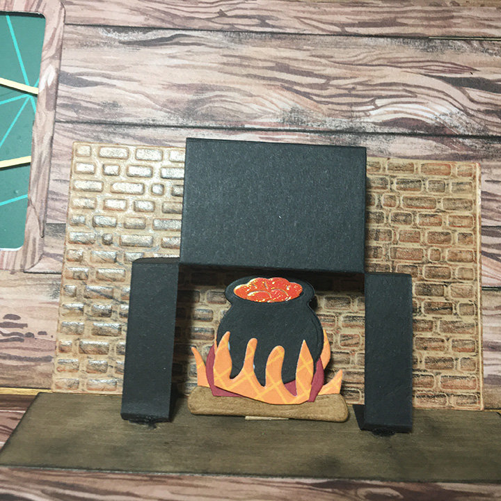 I find it easier to attach anything hanging from the fireplace mechanism before I install the mechanism. After experimenting with how best to attach the pot from the Good Luck Charms set, I ended with gluing the charm circle loop to the part of the mechanism where the Santa boots would dangle. I glued some flames to the bottom of the pot to make the fire be all around the pot. The pot moves a little when opening and closing the card.