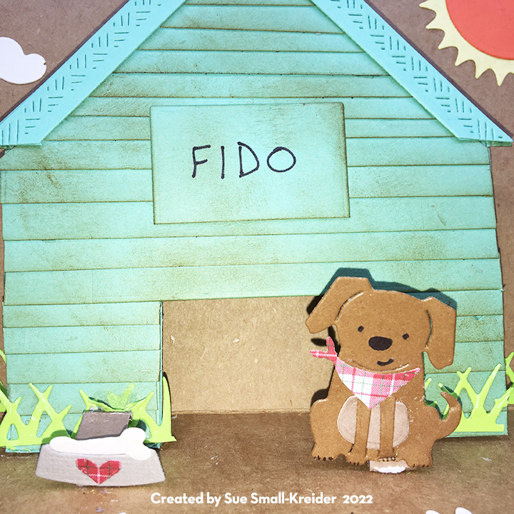 Accessories: Fireplace tools and fender are from the Fireplace Extras 1 set. The lantern is cut from silver holographic cardstock colored with black permanent marker using the small lantern die from the Camping Charms set. The fish is also cut using a die from the camping charms and uses shimmer cardstock with distress inks. The metal plate the fish is on uses the circle from the snowman set. The rugs are from the oval crosshatch set and the deer head is the Christmas animals set on a plaque cut from the smallest crosshatch labels’ set covered in Glossy Accents. The only die that is not Karen Burniston is the fishing rod by Tayored Expressions.