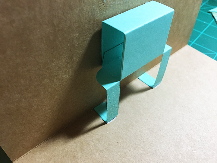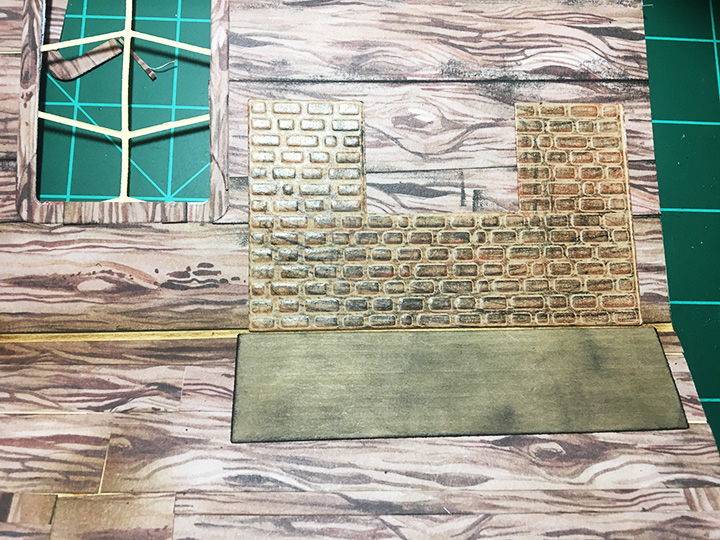 I glued one of the brick fireplace fronts upside down as the back wall of the fireplace. Next is the hearth piece colored to be sooty sandstone that glued to the floor of the card.