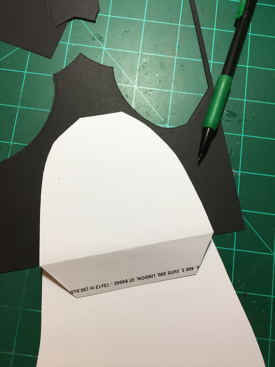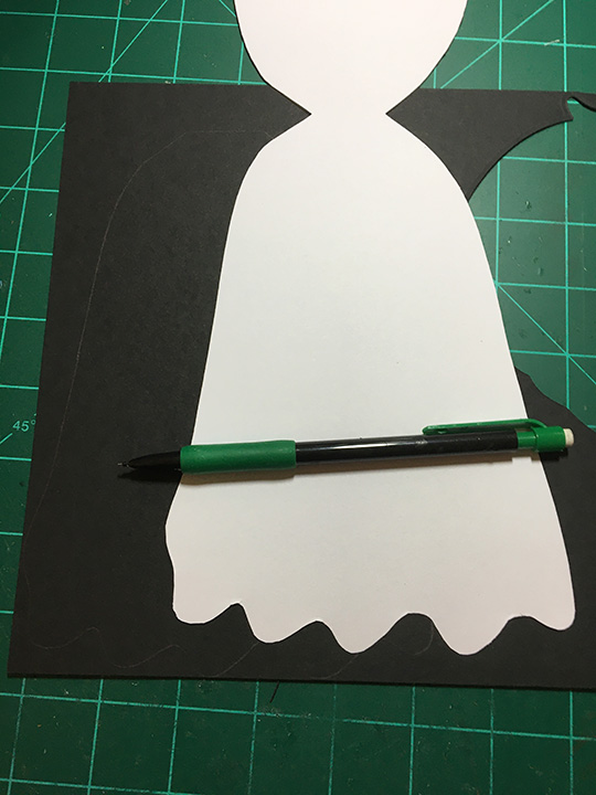 I traced the easel piece as well as the whole ghost back onto black cardstock and cut both pieces out. The easel back piece needs to be glued so that when the white ghost card front is glued onto easel flap the eyes show through as black.