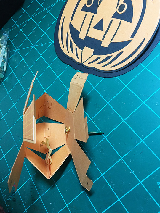 (Donβt glue the whole black ghost shape onto the back of the card until after the pop-up balls have been attached to the card base. This piece hides the brad legs.)