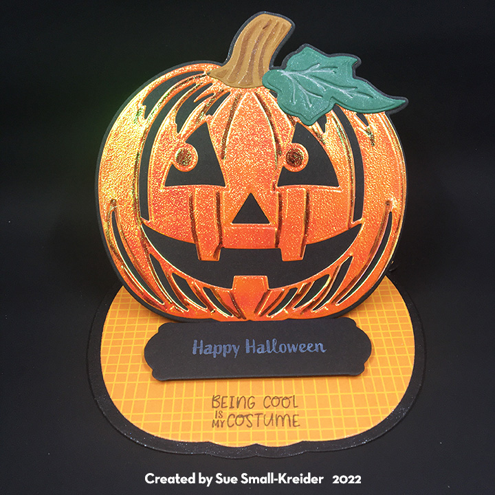 The card front pumpkin and easel base are a die set by Anna Griffin and the pop-up pumpkin inside is made using dies by Karen Burniston.