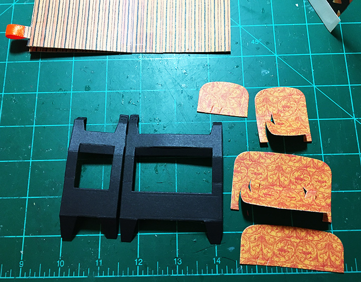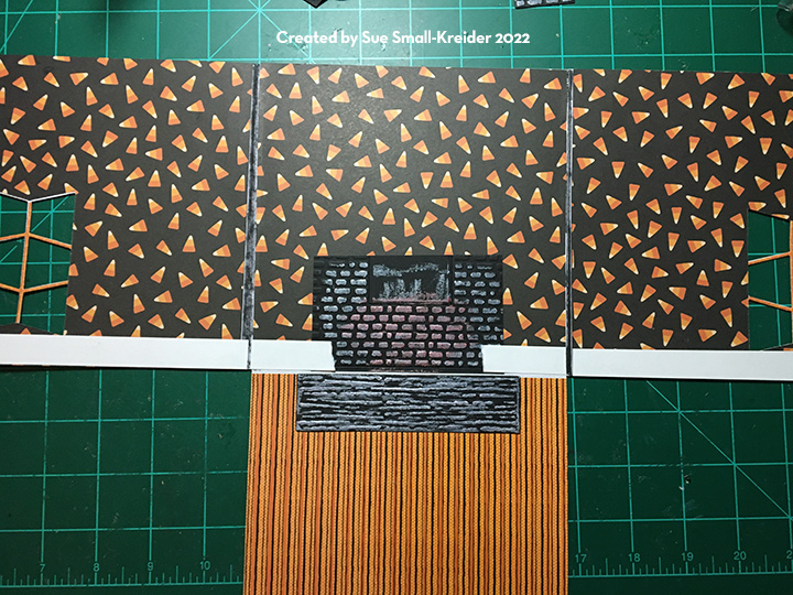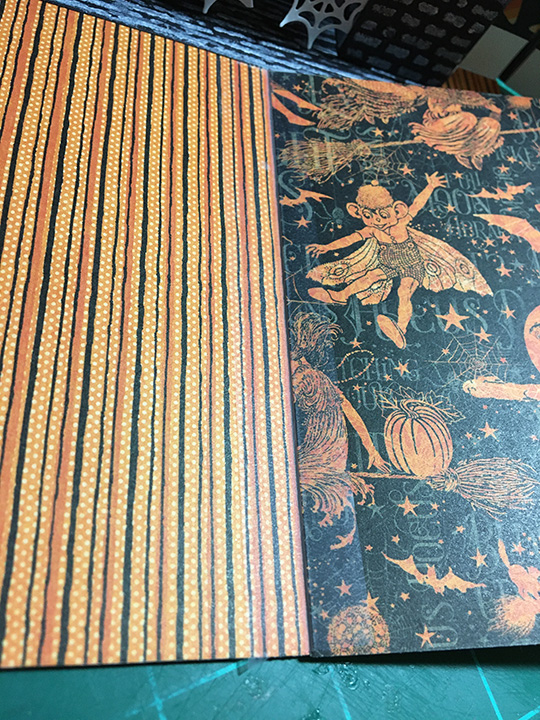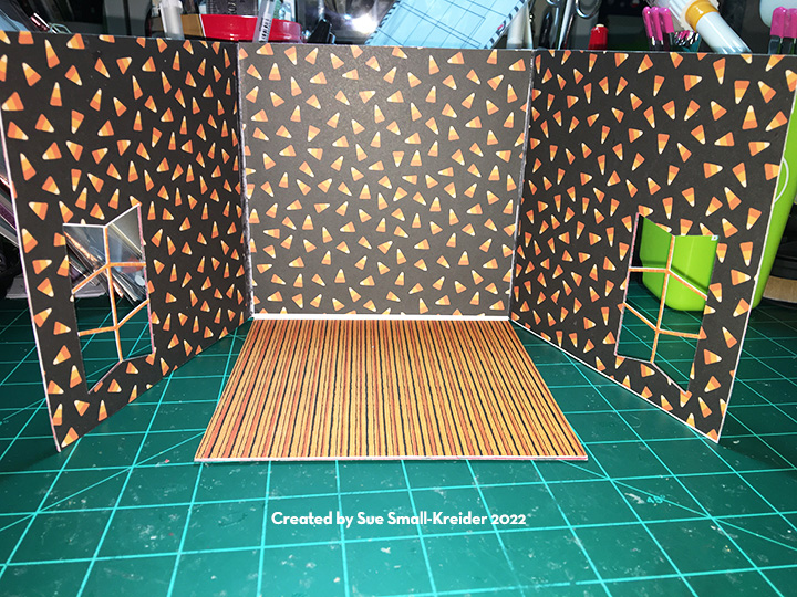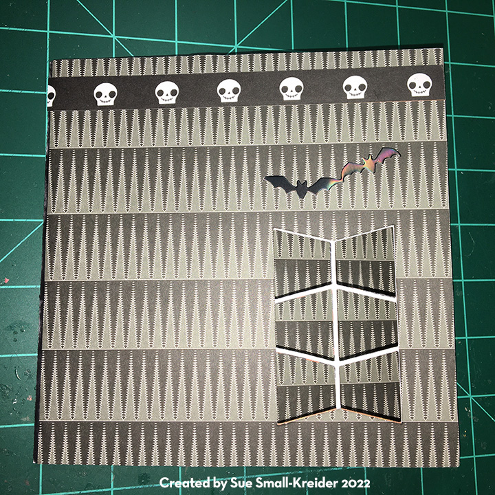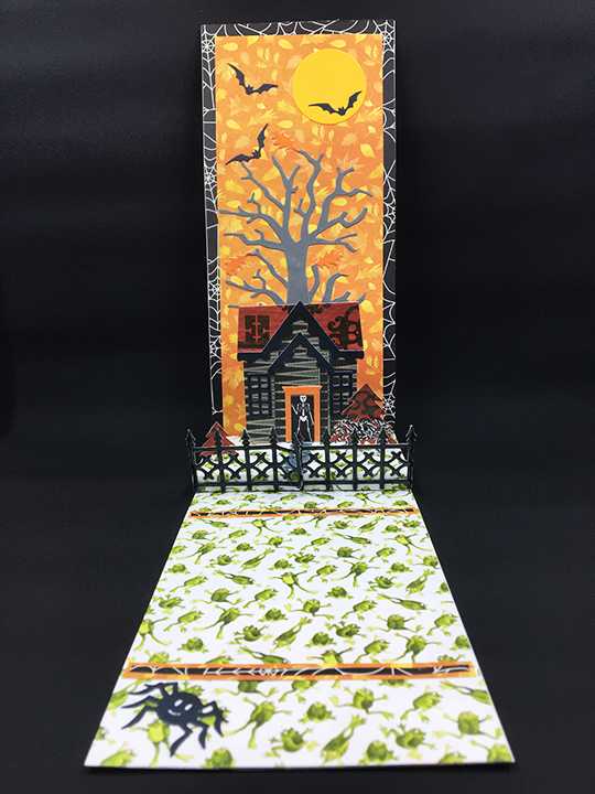 Glue the thinnest of the papers that will cover the side squares and cut the windows into these pieces using the six-trapezoid cutting die from the Mini Ball Pop-up Double-Ups. Use the side panels to mark the location to cut the window in the thickest of the decorative papers. Glue all the decorative papers onto the side squares. Glue the flaps on to the top half of the folded card base. Glue the remaining decorative papers onto the card base. (I made a mistake when I glued the decorative bat pattern plate onto the orange back of the card and ended up with them upside down. The glue set before I noticed my mistake.)