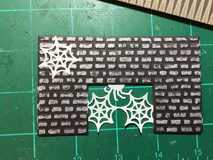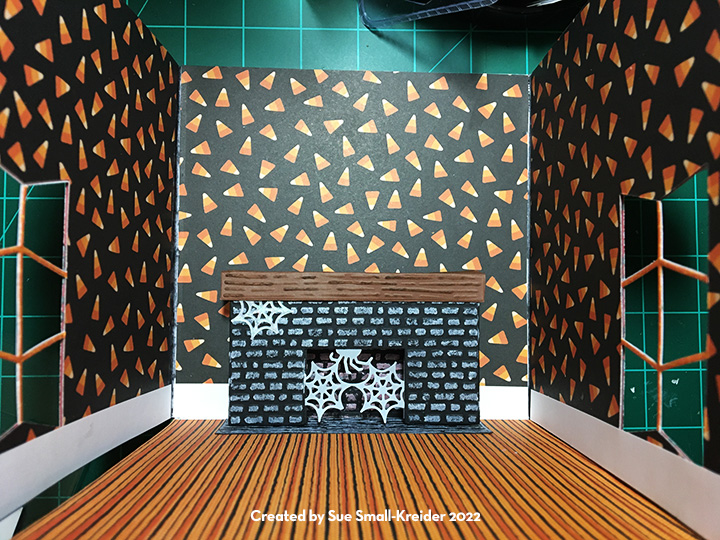 Die cut a partial patterned plate of spiders and webs of vellum. Separate some webs and spiders. To decorate the fireplace and other parts of the room. (I used some thin foam squares to make the mantel standout over a web.)
