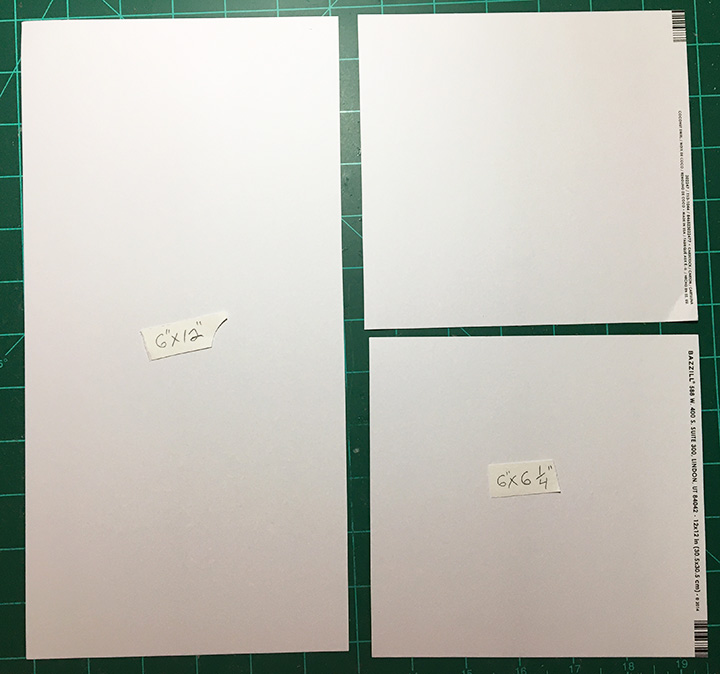 Card Base: There are three pieces that need to be cut and assembled to make the card base. Lightweight to medium weight cardstock is ideal as there will be decorative papers glued to all sides of the card which will strengthen the base. Cut one piece 6×12 inches and fold at center into a 6×6 card. Cut two 6 x 6 1/4 inch squares. Score and fold 1/4 inch to make the squares into 6 x 6 inches.