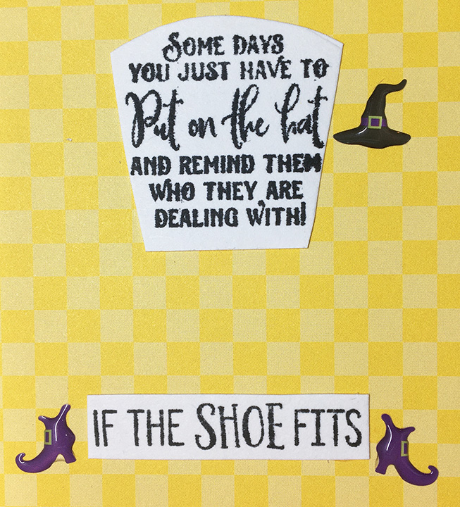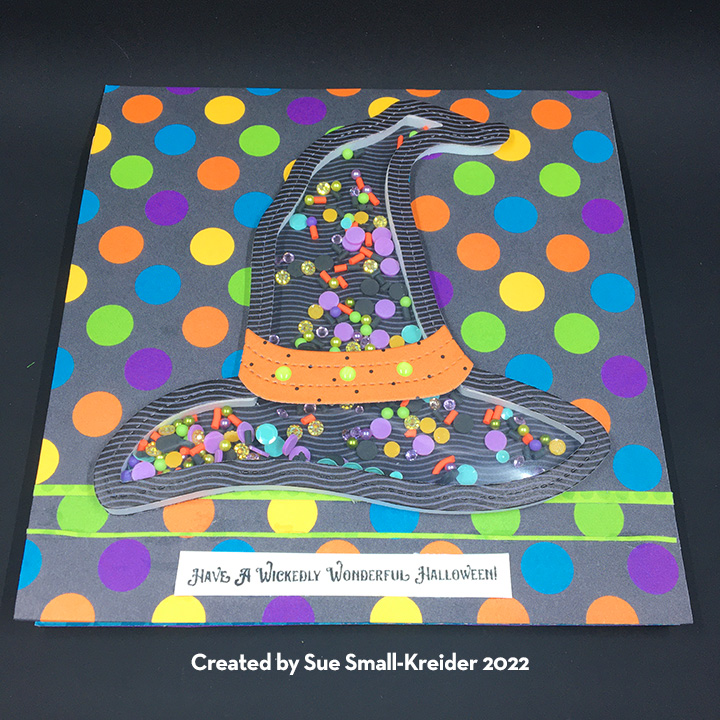 Queen & Co. Halloween shaker kits have me under their spell This card is made up of elements from two kits β Fright Fest (shoes and papers) and Witch Hat. These kits have the dies, foam shaker frames and acetate windows. Some come with the shaker elements (I added to them from my stash) and/or matching paper (Fright Fest for this card.)