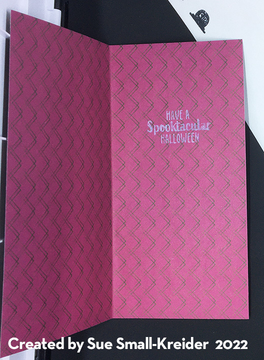 I made a band to hold the card closed from a leftover piece of white cardstock. The βBOO!β on the ghost as well as the band sentiment are by Karen Burniston from the two Halloween die sets listed below.