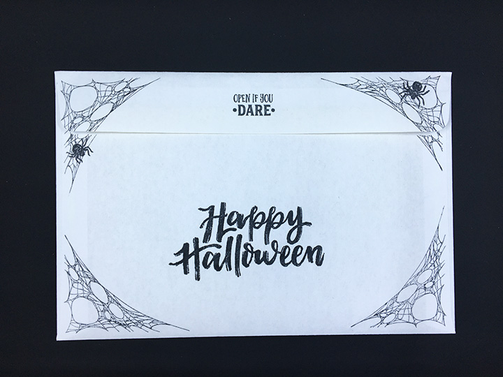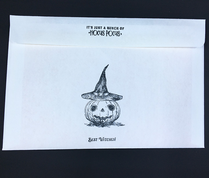 The card fits into a 6 x 9 inch envelope. I stamped the front and back of the envelope with ghost stamps by Julie Ebersole.
