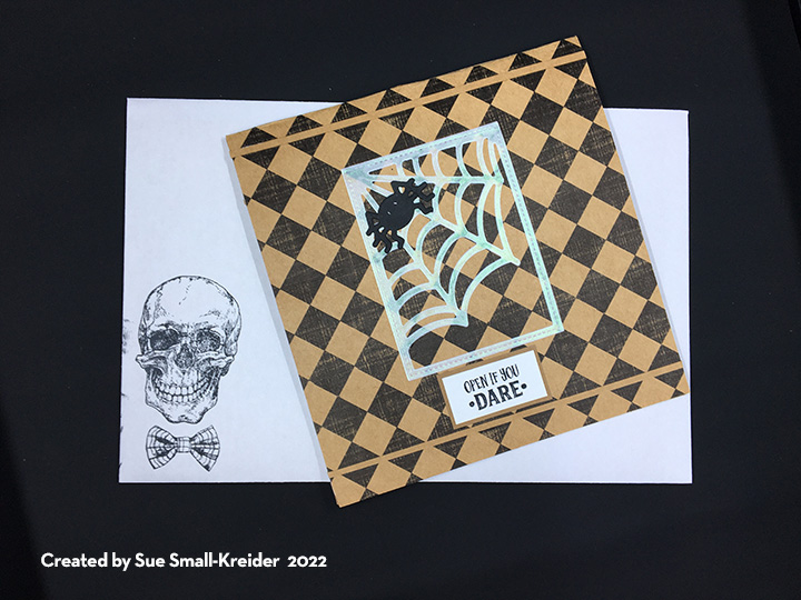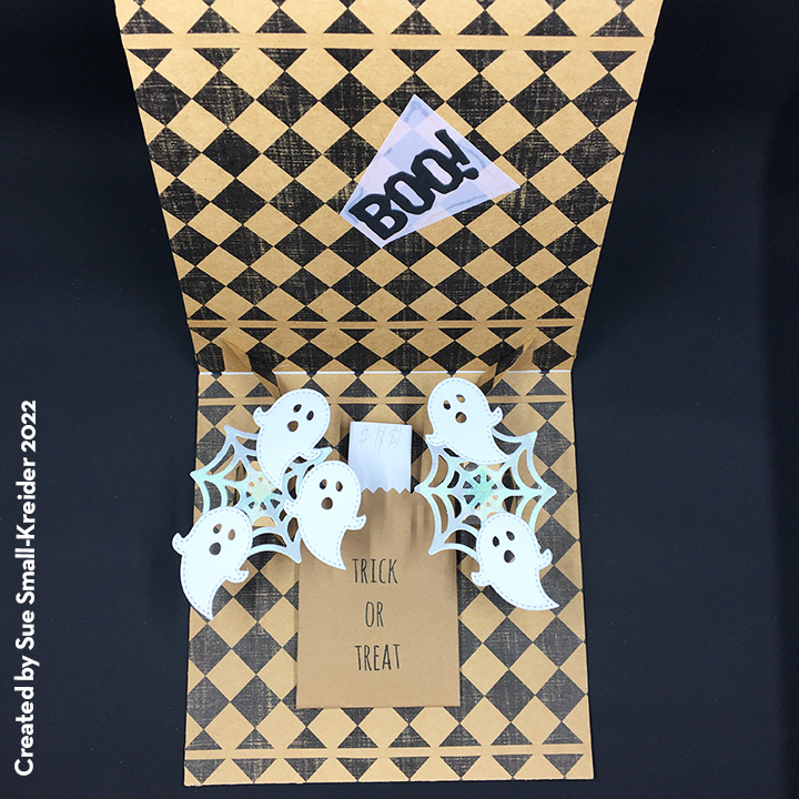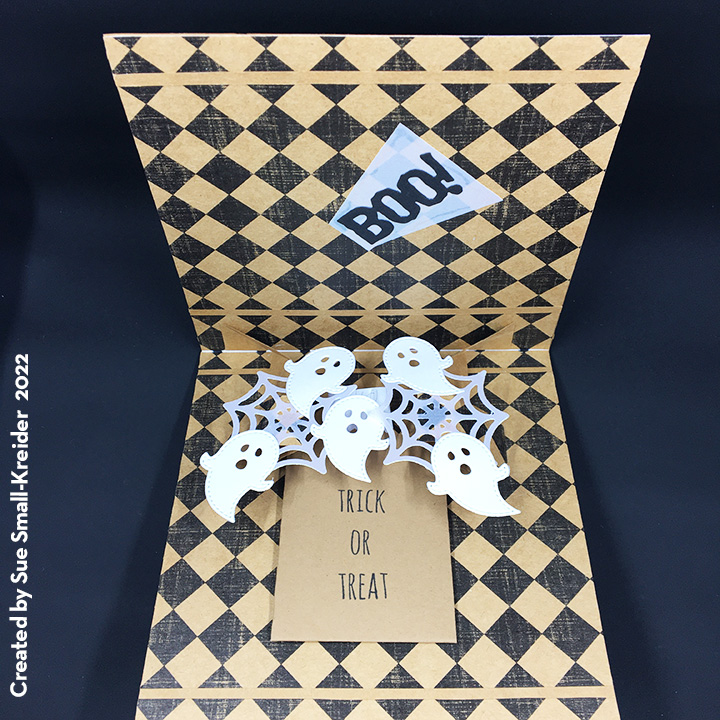 The ghosts and spiderwebs are from the Queen & Co Halloween Foundation Dies and the Paper Studio checkerboard brown craft paper has been in my stash for a while.
