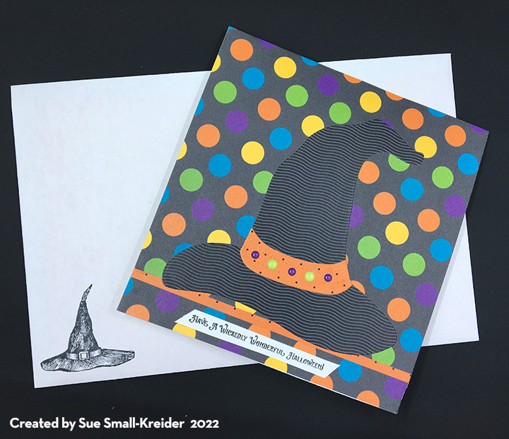 The original card called Witchy Shoes and this card are made with dies and papers from Queen & Co. Halloween collections – Fright Fest (shoes, pumpkin & papers) and Witch Hat die.