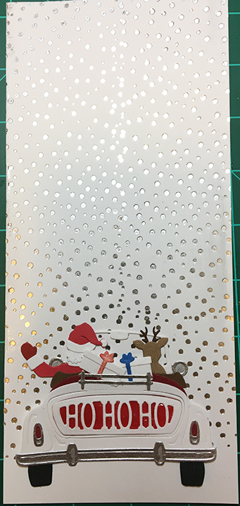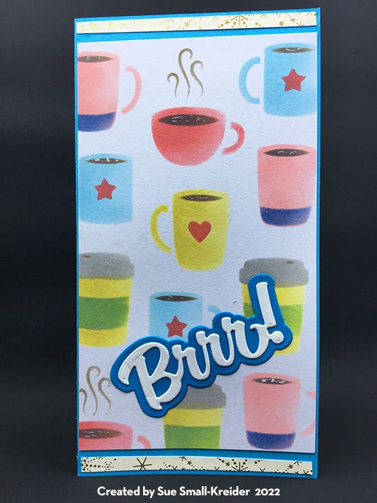 This is a slimline card version of a non-traditional color scheme Santa scene that I used on another project that will be unveiled during the sneak peak week of Karen Burniston’s December 2022 release.
