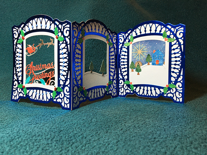 The front sentiment and pine branches are all by Karen Burniston. The tiny bows are from the sleigh die set while the pine branch is from the Holiday Charms set.