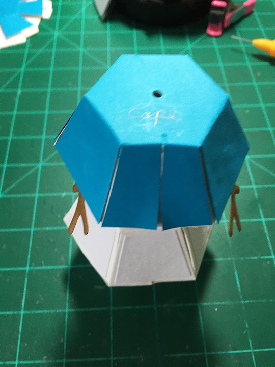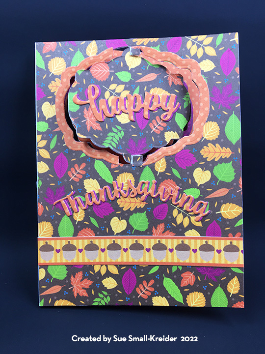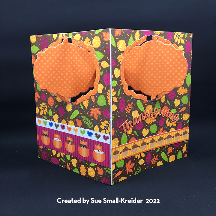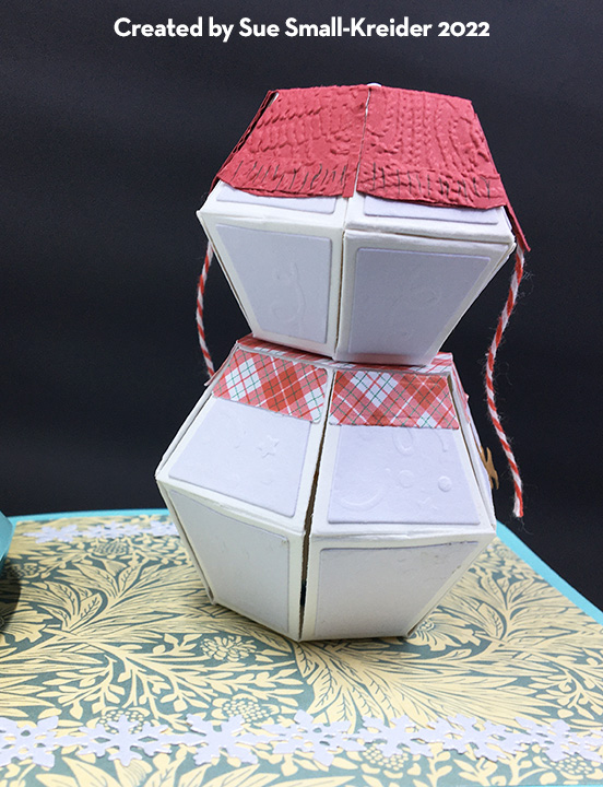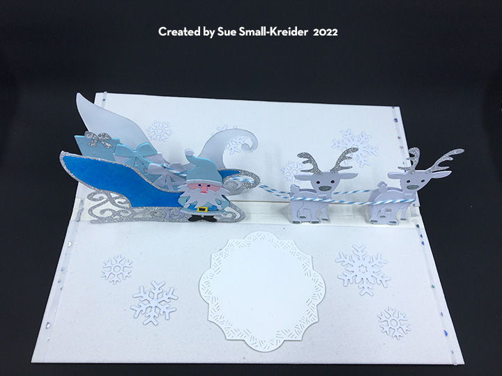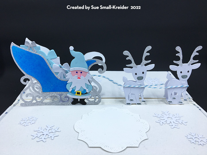 To create the the inside pop-up scene, I used four of Karen Burniston’s previously released die sets – Sleigh Pop-Up, Christmas Animals and Gnome and Santa. I had to reverse the direction of the sleigh to make it work with the reindeer dies. The reindeer are each made up of two die cuts that are glued together at their antlers and have the face colored on the front side only, but with narrow strips of cardstock forming “U” shaped bases for the feet to be glued onto. Blue and white baker’s twine is glued on to the reindeer for the harness and reins.