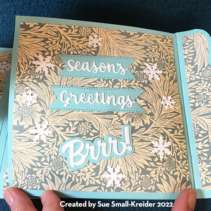 Velvety flocked paper lines the inside of the card with crisp white snowflakes (from holiday charms and sleigh die sets) and a fancy edged label for a personal message finish the inside scene.
