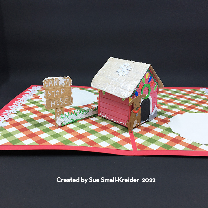 The snowy look on the roof was created by painting a thick coating of glitter gloss and using Effect Snow around the edges. To hold up the “Santa Stop Here” sign, a grassy strip from the Mushroom Tiny House Add-Ons set was cut, Effect Snowed, and glued to the card base and dog house. The sign is made from three of the school signs from the Church and School Tiny House Add-Ons set.