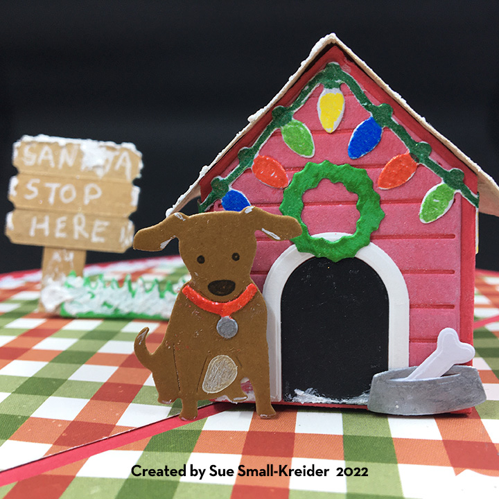 For the colorful lights, use the lights from the Holiday House die set. (I used shimmer paper and colored them with fine-tipped markers.) The wreath is also from the Holiday House. Pup is added to the front of the dog house with a thick foam dot.