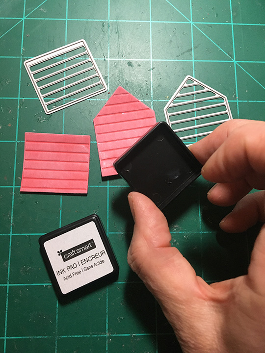 To create the dog house, cut out and assemble a red Tiny House. (See assembly video.) I used the same red lightweight cardstock for the side panels from the add-ons. I choose not to ink the dies to print the siding lines, but rather to emboss them and then, using a white ink cube, to add a powdery dusting of snow.