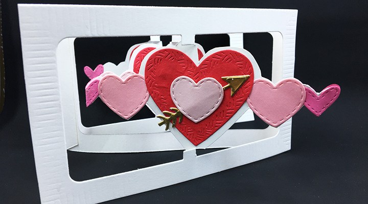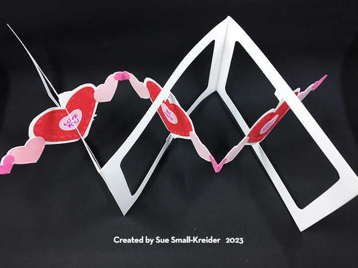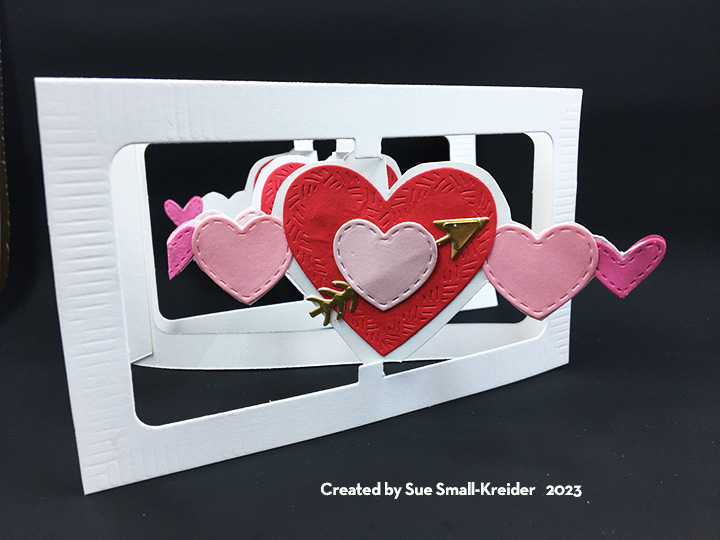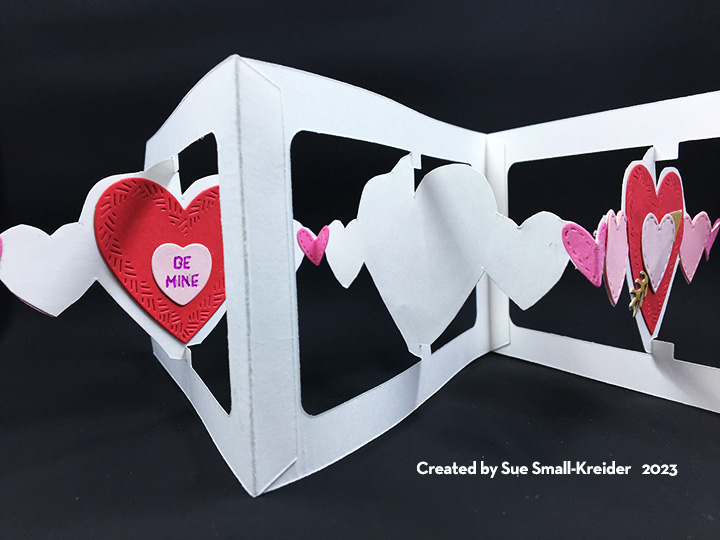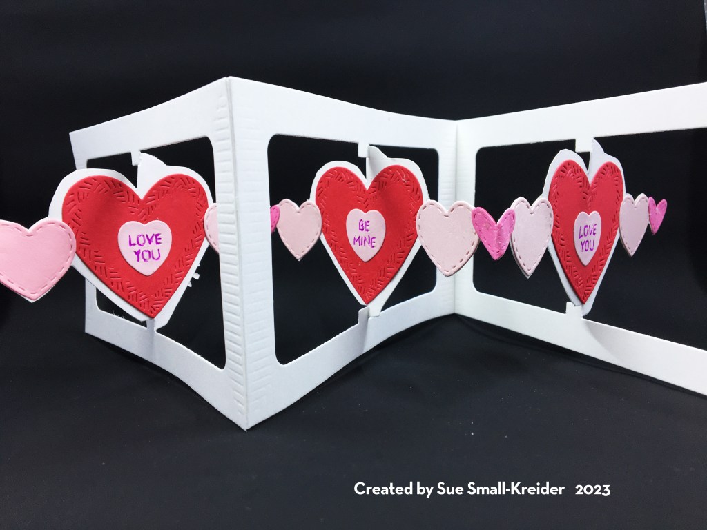 This is a quick fussy cut string of hearts using Karen Burniston’s Landscape Rectangle Accordion die. The large red hearts and smallest dark pink hearts are from the Hearts-Crosshatch set while the medium size pale pink hearts and hearts with sentiments and arrow are from the Love Charms set. (I used a purple gel pen to highlight the candy heart sentiments.)
