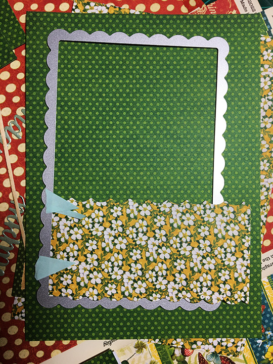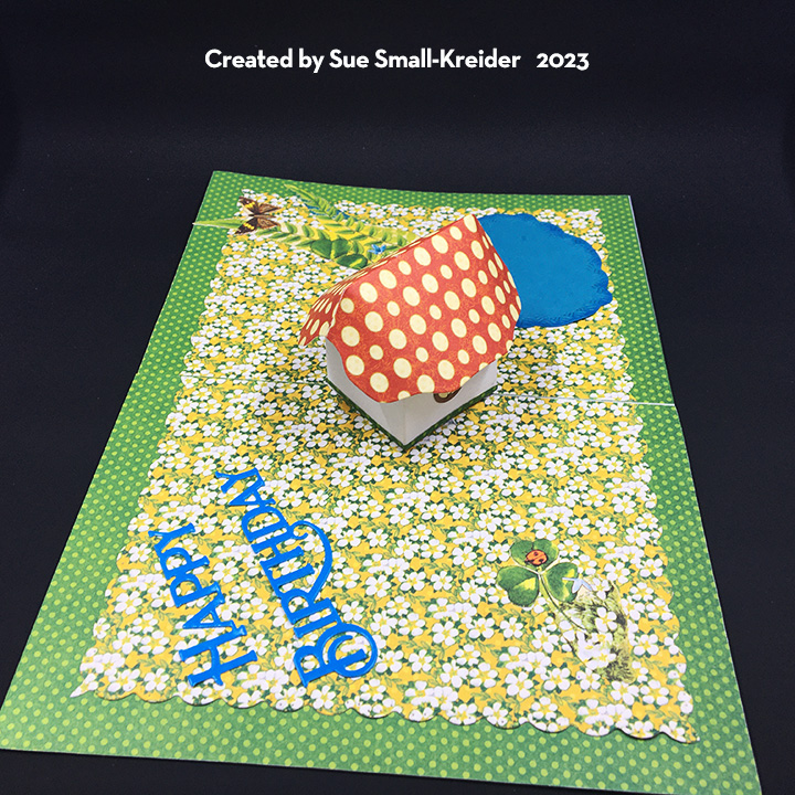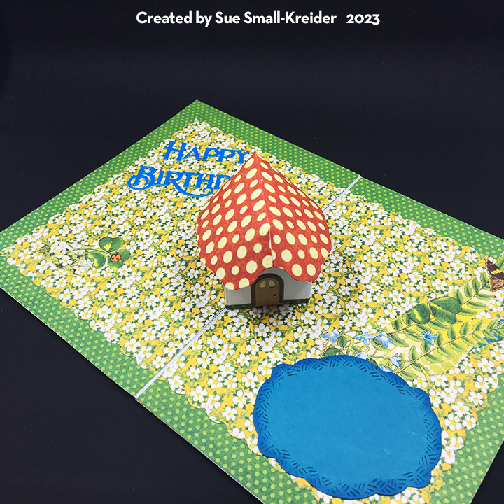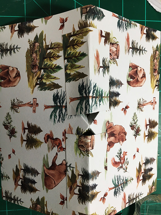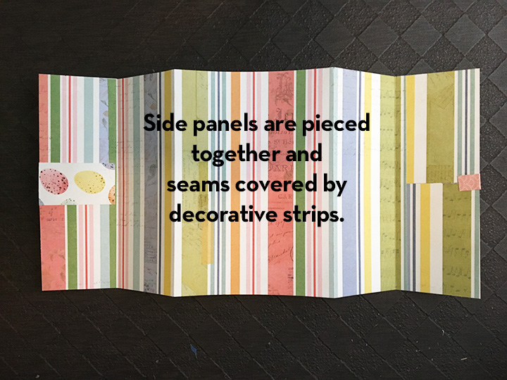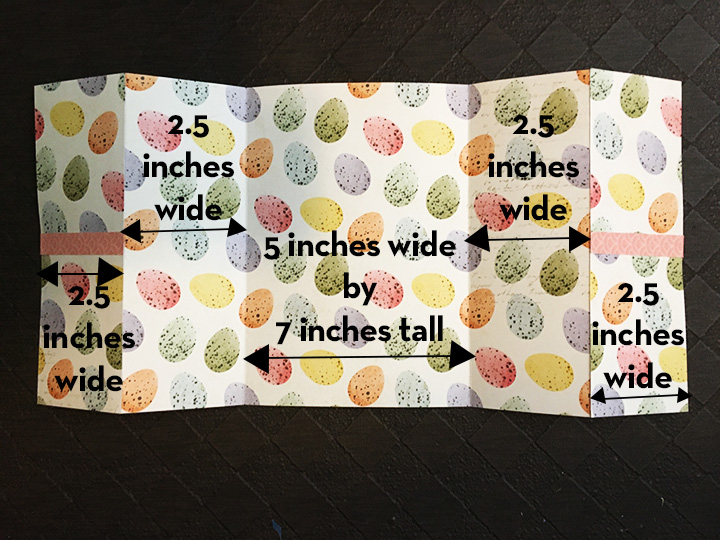 The card base is an extended gatefold with aperture windows cut through the front and side panels that allow two spring animals to peek out the card front. From a 12×12 sheet cut a 10.5×7-inch rectangle. Score and fold at 1/4-inch, 2 3/4-inches, 7 3/4-inches, 10 1/4-inches. Glue front panels (2.5×7 inches) to the side tabs. (I had to piece together my front panels using decorative strips of paper to hide the seams.)