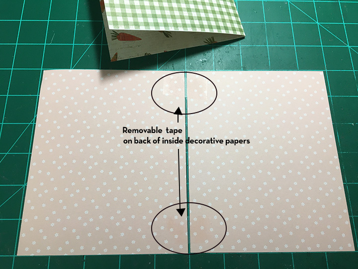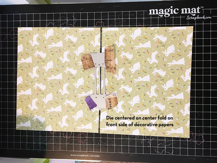 Pop-Up Panels: Because I was limited to using paper from a single 6×6-inch paper pad, I found that the largest die was the flower pivot panel which had to be cut diagonally from the square of double-sided paper. Once this was cut, all other pieces had to be cut based off the direction of the stripes. Two dotted 6×6 squares were joined together with clear removable tape on their backsides and die-cut using the X mechanism die from the twist panel pop-up set. I used the excess strip of 1-inch cut from both the square dot panels to fill-in the holes where the mechanism folds up. Next, I glued the dotted panels into the card base with the clear tape joint going into the fold. The arms of the mechanism were die-cut from purple and glued to the X mechanism.