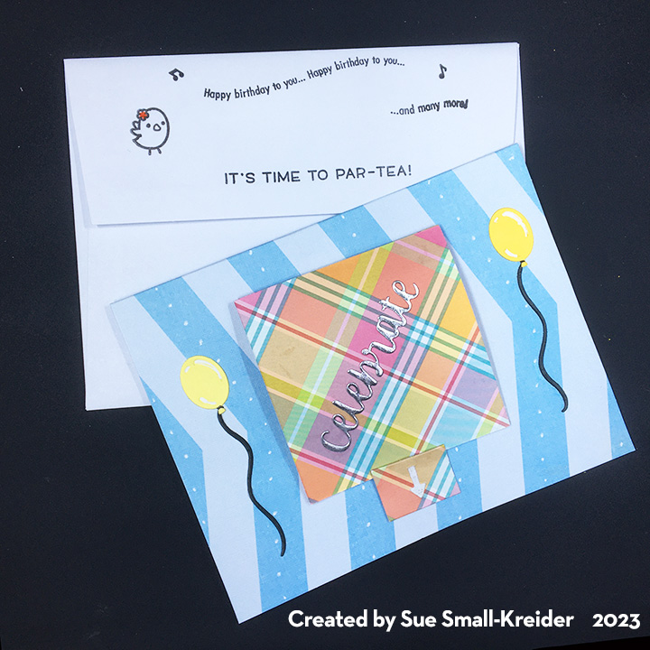 Sentiments: A large shadowed “Happy Birthday” was die cut from red and yellow to standout on the dark front. Stamped Funny Bones sentiments from Riley and Company grace the inside of the card and the envelope’s back flap.