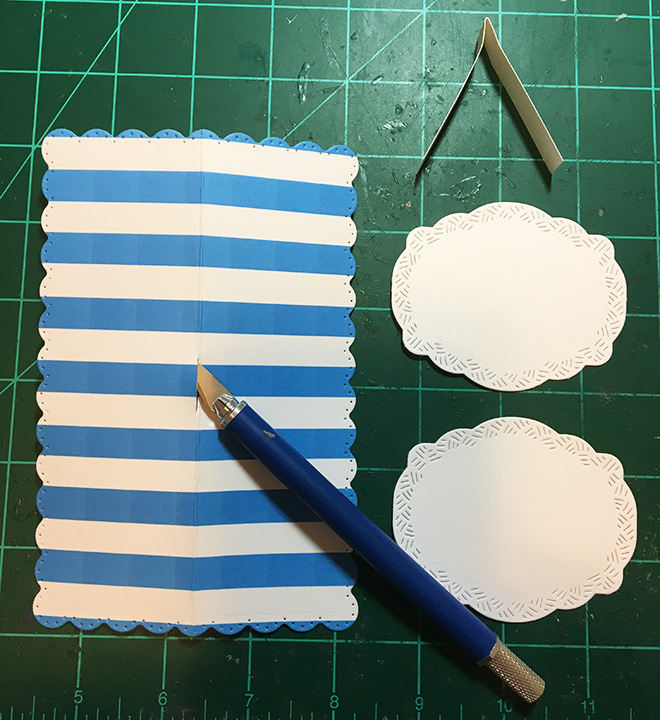 Roof Frame: The striped roof awning is cut from some digital striped paper using the large scalloped edged rectangle in the Rectangles and Labels – Crosshatch set. It is held up by a frame made by die-cutting two of the Fancy Label Accordion in white cardstock and cutting off the center pivot panel and side tab. (My cardstock was lightweight, so I cut a third frame and cut it in half to back the lower portion of my frames.)