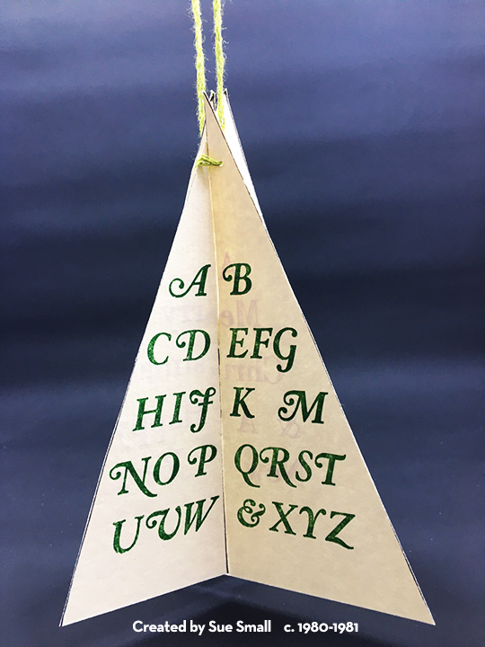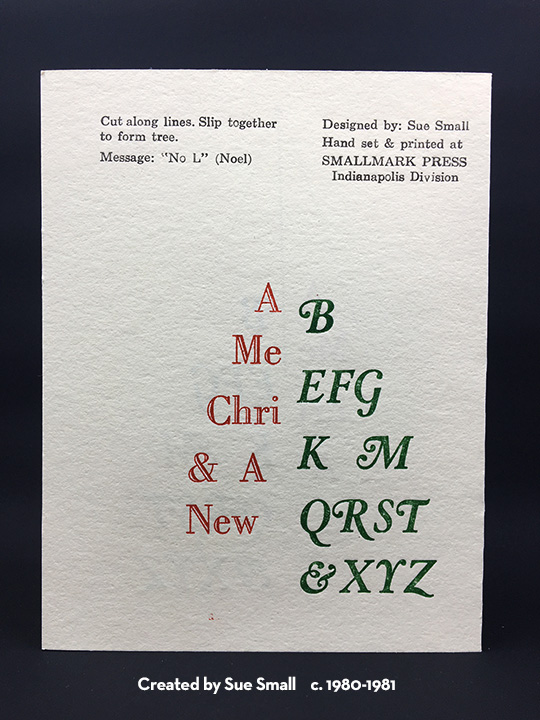 The NO L Tree card was a mash-up of another Christmas card my parents had done in the 1950s spelling out the alphabet but leaving a space where the “L” would have been, and a 3D triangle tree that I had made as a child which was made of two triangles cut with slits that allowed them to slide together. My father suggested having the sentiment in red ink be on two quadrants while the green alphabet be on the remaining two quadrants. We decided on different type fonts for the two sides.