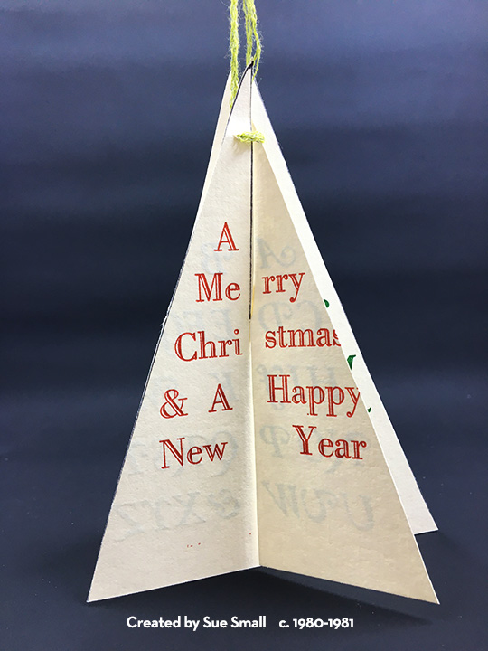 Instructions on how to assemble the tree as well as the card title/subtitle and card credits were all made with hand-set type. To print one card, it took two runs of green ink, two runs of red ink and one run of black ink for a total of five runs and one hand tracing of the triangle lines. We would print 200+ cards each year and start printing in October.