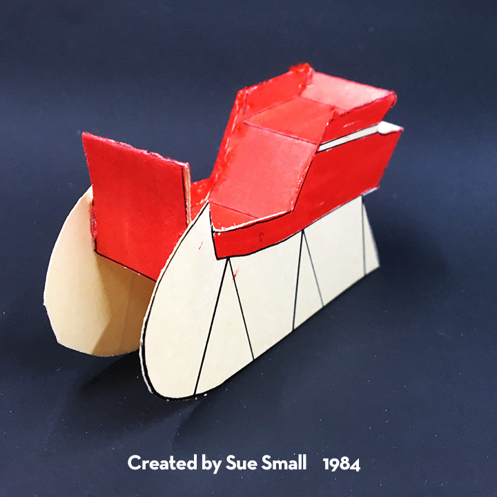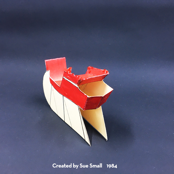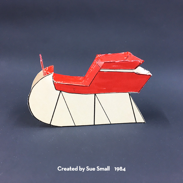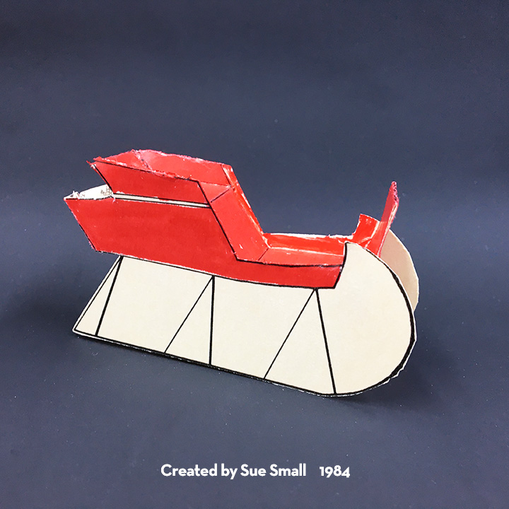 The sleigh was manipulated on a photocopying machine. The image was cut-out twice and one image flipped on its back side and traced with an ink pen. A ruler and protractor were used to create the rectangular shapes and tabs that connected the sides. Rub-on lines were used to create the various thickness of lines and perfect corners.
